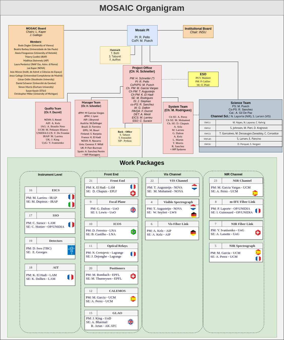 The MOSAIC Board has the role of assisting the PI in all the different phases and aspects of the Project. It is the supervisory structure of the Consortium. The members of the MOSAIC Board are the Co-Is, which represent each participating country. The PI, co-PI and PM are invited to all meetings of the MOSAIC Board. The main role of the management board is to follow the milestones of the project in coordination with the PIs, to review the Consortium Agreement, and to organize the scientific and financial support of MOSAIC. The current board Chair and Deputy Chair are Lex Kaper and Jesus Gallego, respectively. The committee is composed of : Jose Afonso (IA, Lisbon Univ.), Portugal - Beatriz Barbuy (IAG, Sao Paulo), Brazil - Christopher J. Miller (Univ. of Michigan), USA – Thierry Contini (Toulouse, IRAP), France - Alexis Finogenov (Helsinki Univ.), Finland - Jesus Gallego (Madrid, Computense Univ.), Spain - Lex Kaper (Amsterdam Univ.), Netherlands - Susan Kassin (STScI), USA - Simon Morris (Durham Univ.), U.K. - Goran Ostlin (Stockholm Univ.), Sweden - Laura Pentericci (INAF-Osservatorio Astronomico di Roma), Italy - Matthias Steinmetz (AIP, Potsdam), Germany - Daniel Schaerer (Univ. of Geneva), Switzerland - Bodo Ziegler (Vienna Univ.), Austria | ||